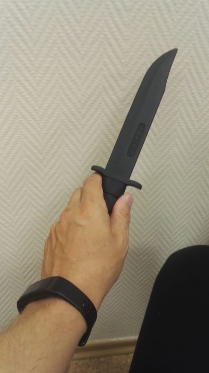 Хороший нож. Приятно сидит в руке, материал не резина - изготовлен из сантопрена . Полимер в меру жесткий и в меру эластичный. Не знаю что о нем еще написать, был бы стальной написал бы больше, а так для тренировок самое то. Если им пропустить тычковый удар то это будет чувствительно как ткнуть палкой, удар не пропустите. В целом обух и лезвие широкие можно на них нанести мел для понимания где пропущен порез. Короче рабочий тренировочный инструмент.